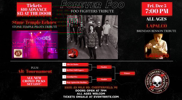 Forever Foo is at Diesel Concert Lounge, Friday, Dec. 5, 2025 at with special guests Stone Temple Echoes [STP] and Lapalca [Brendan Benson]. Plus, get ready for Alt-Tournament, a bracket-style battle between four of the best bands of the '90s! The crowd will determine the set list and winner!